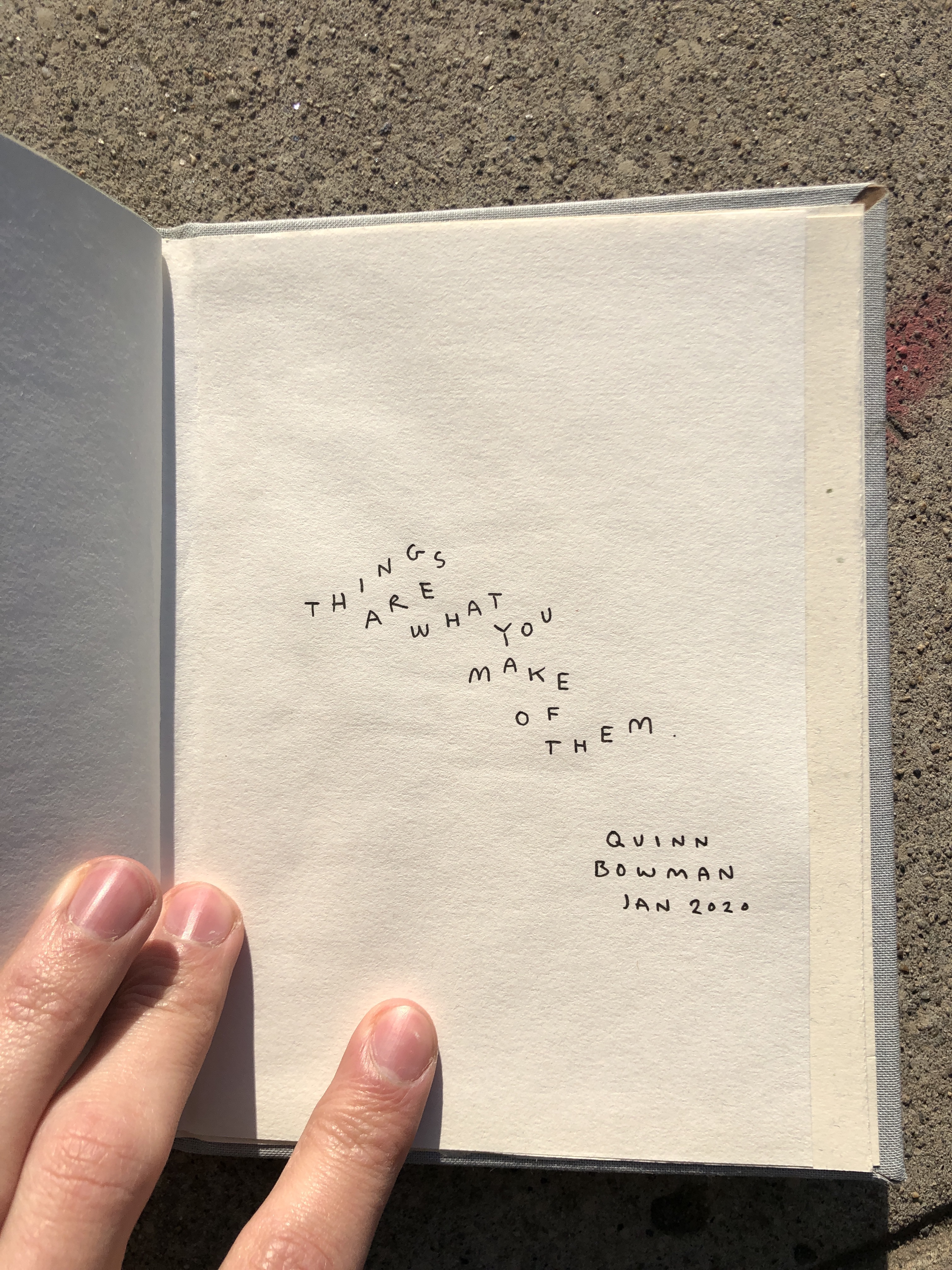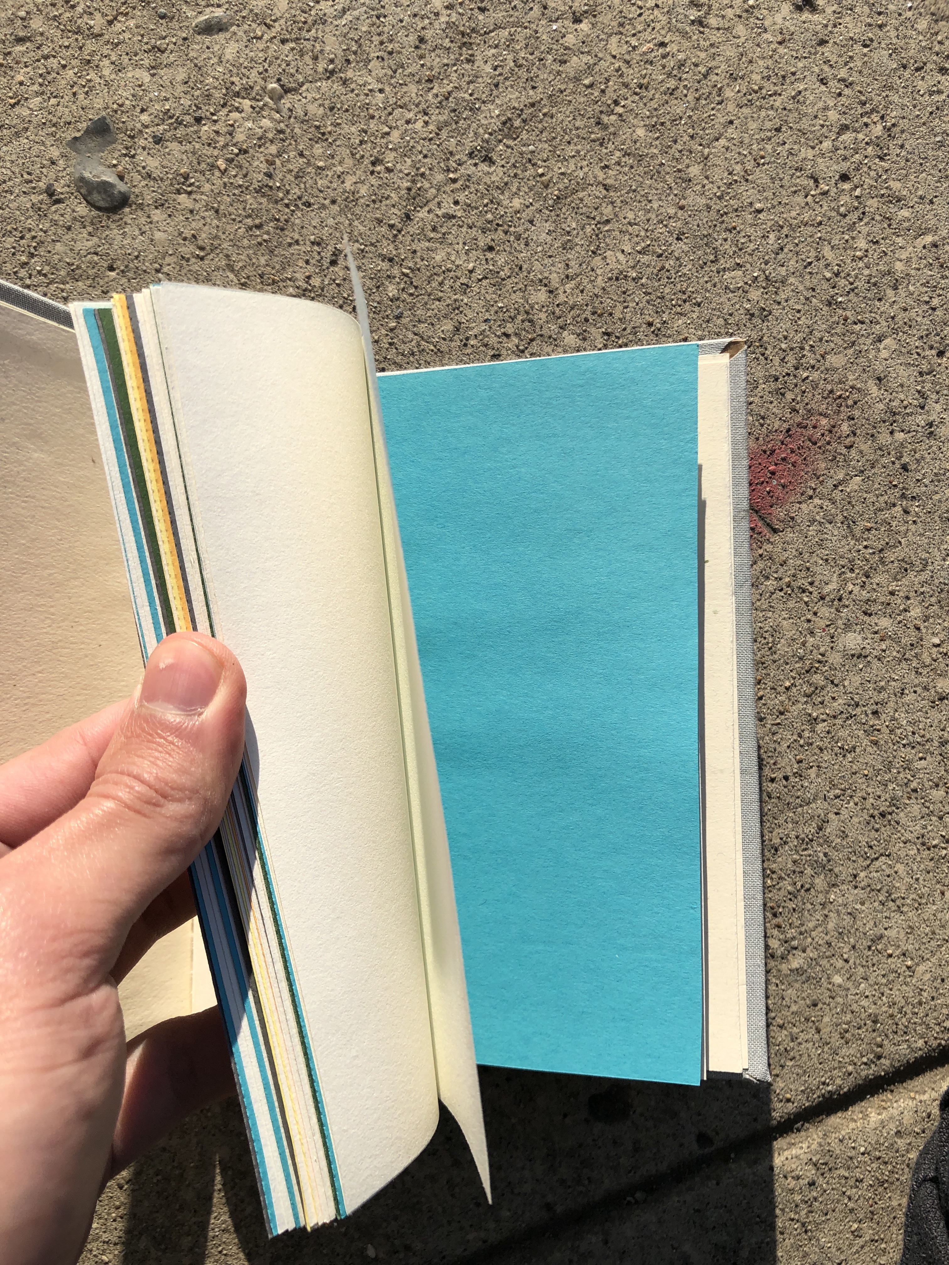 Cloth covered and hand-bound from various colored papers. Cover done with gold paint pen.
