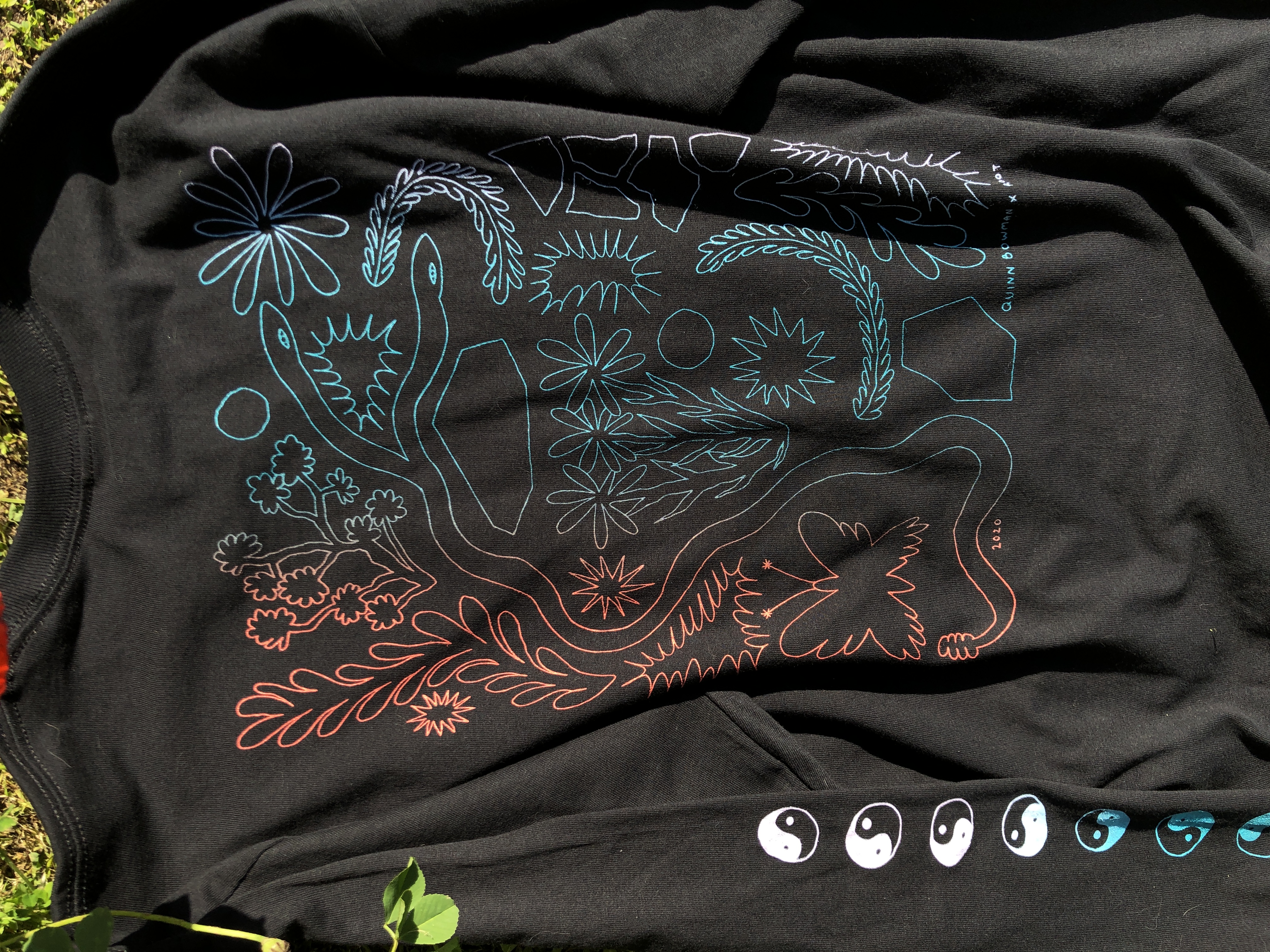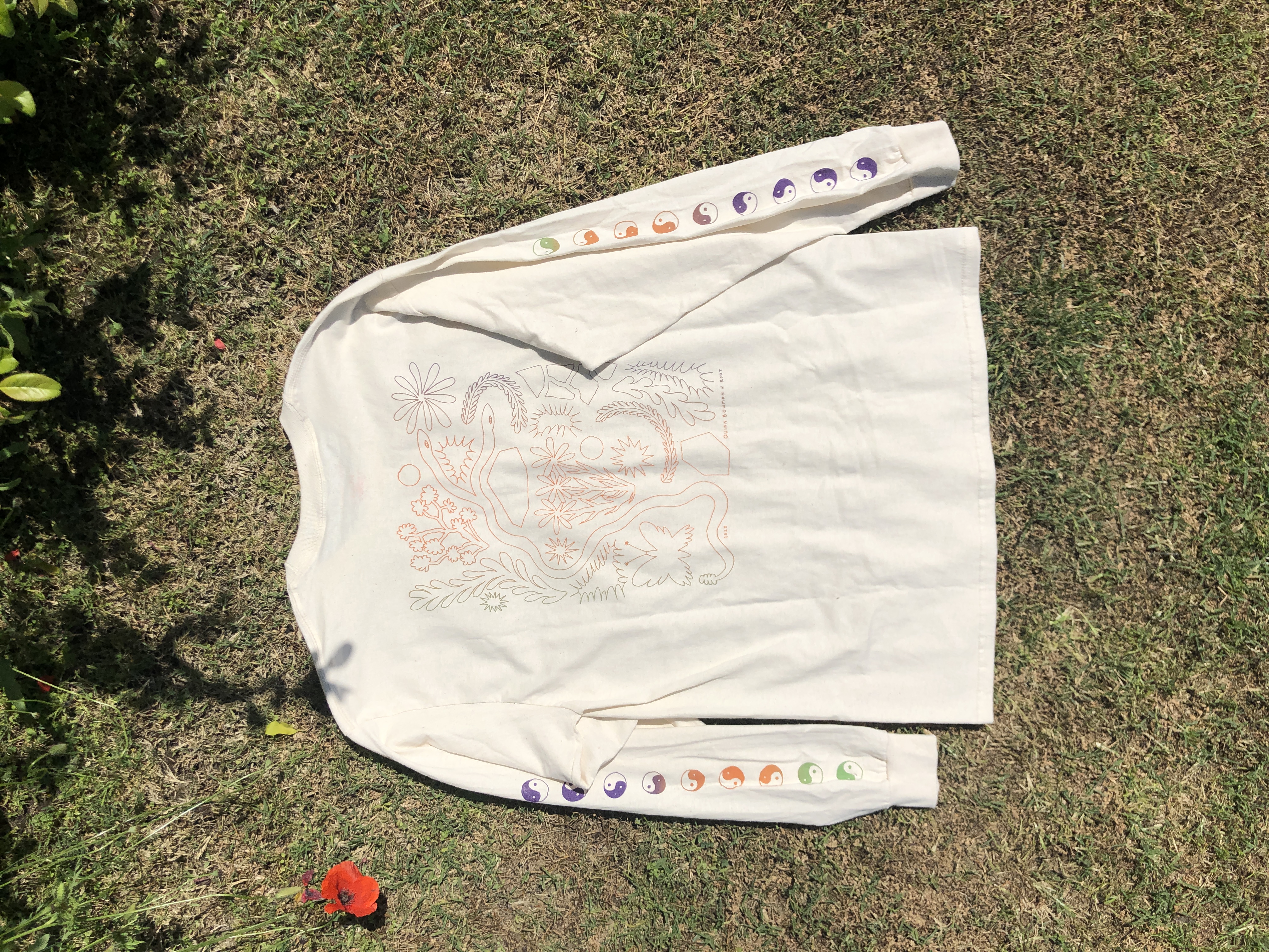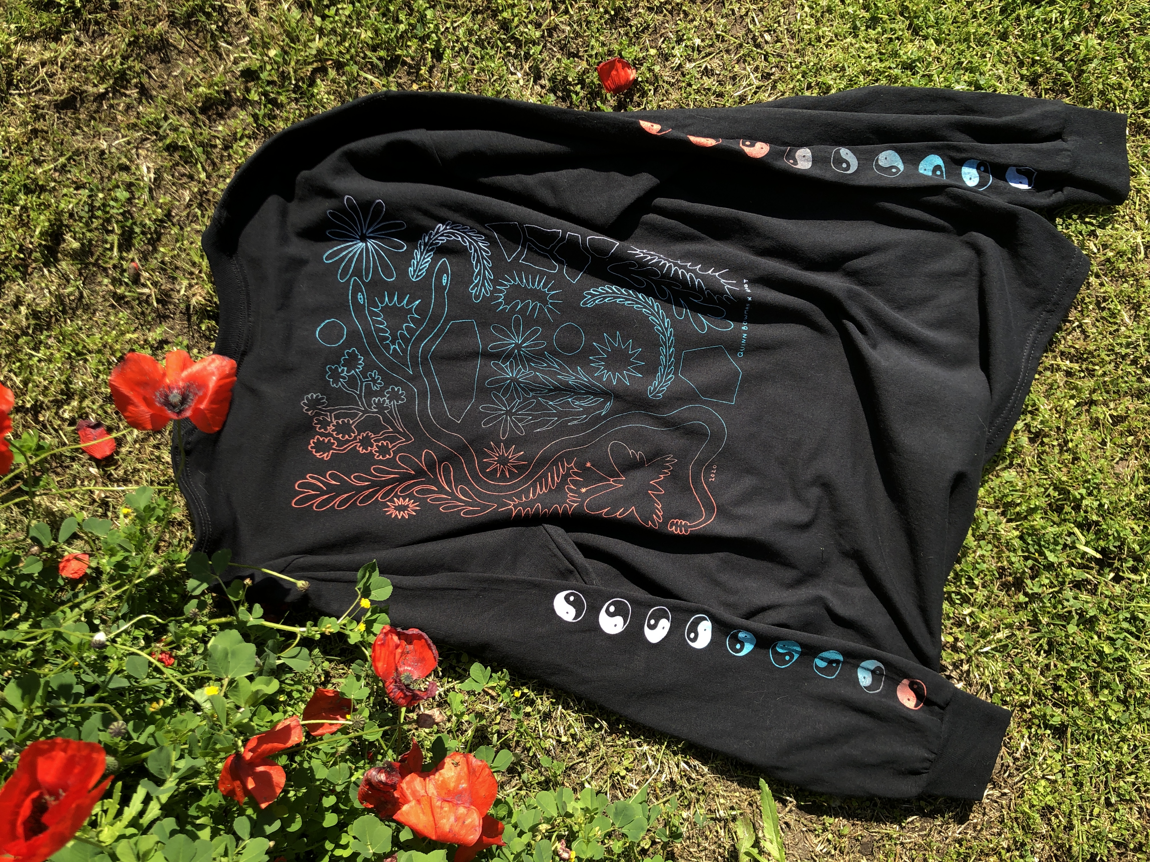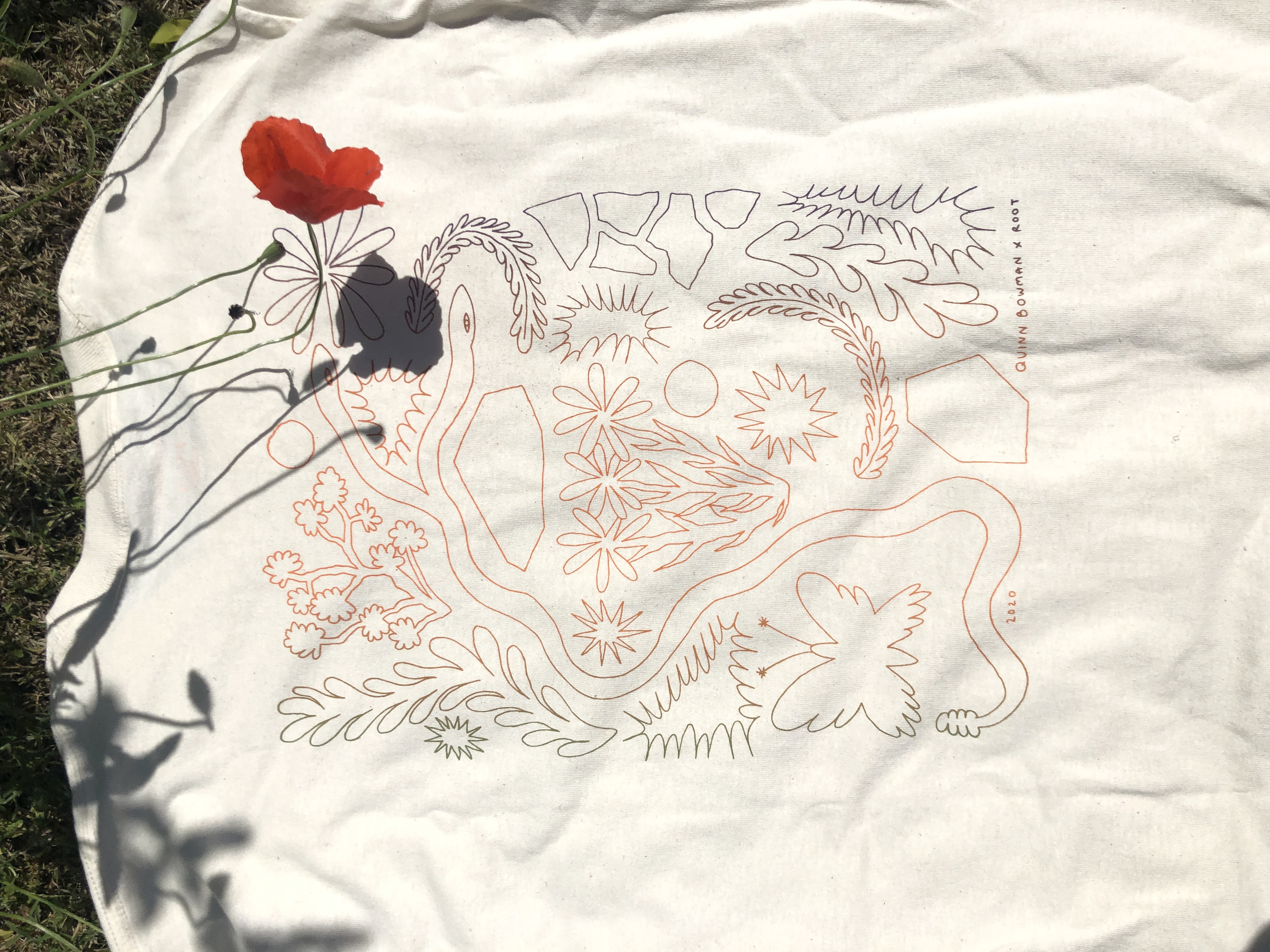 Hand drawn elements printed in tri-color screen-print.