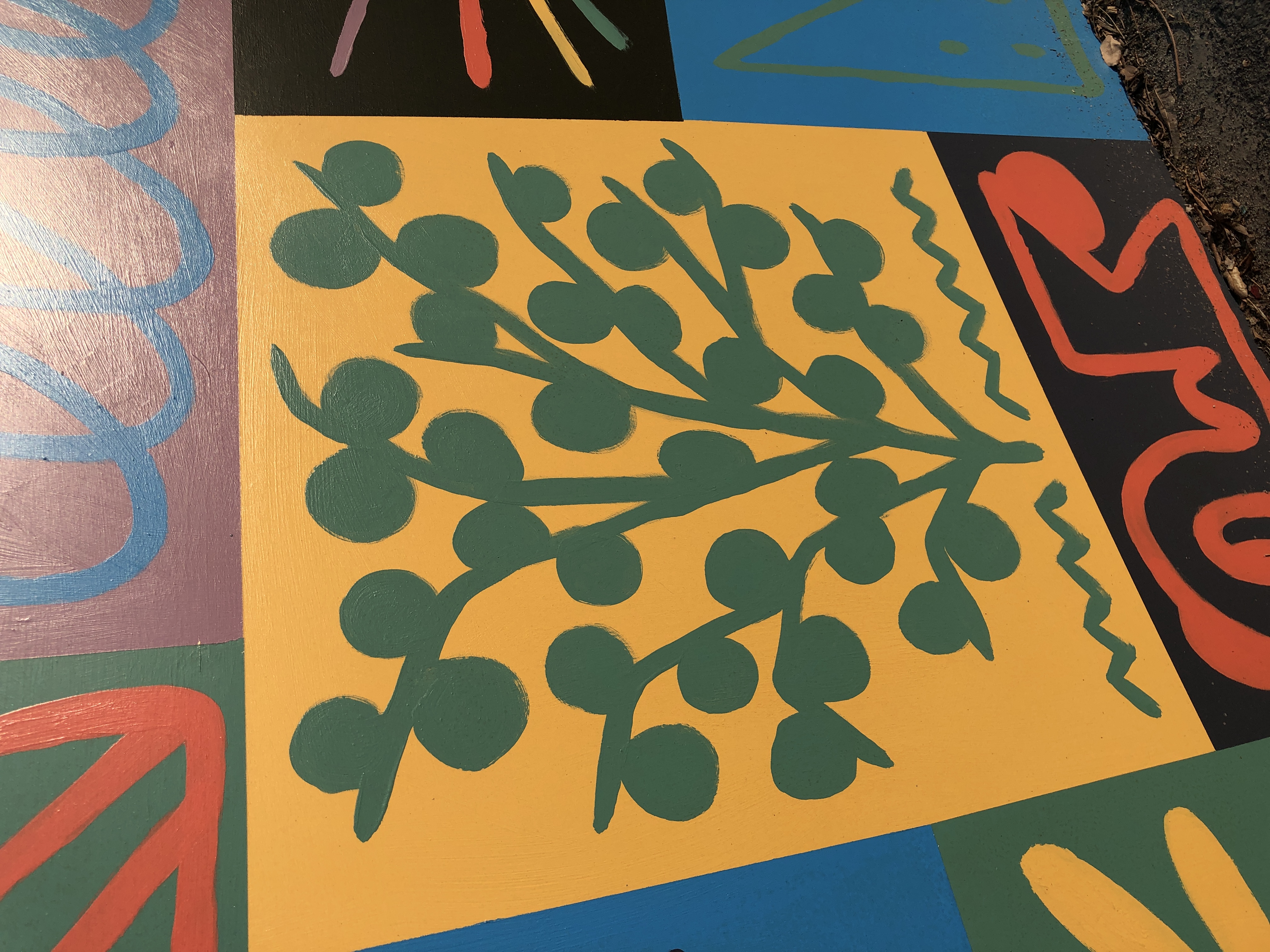 Two hand-painted panels that exist on the facade of an outdoor dining area in front of