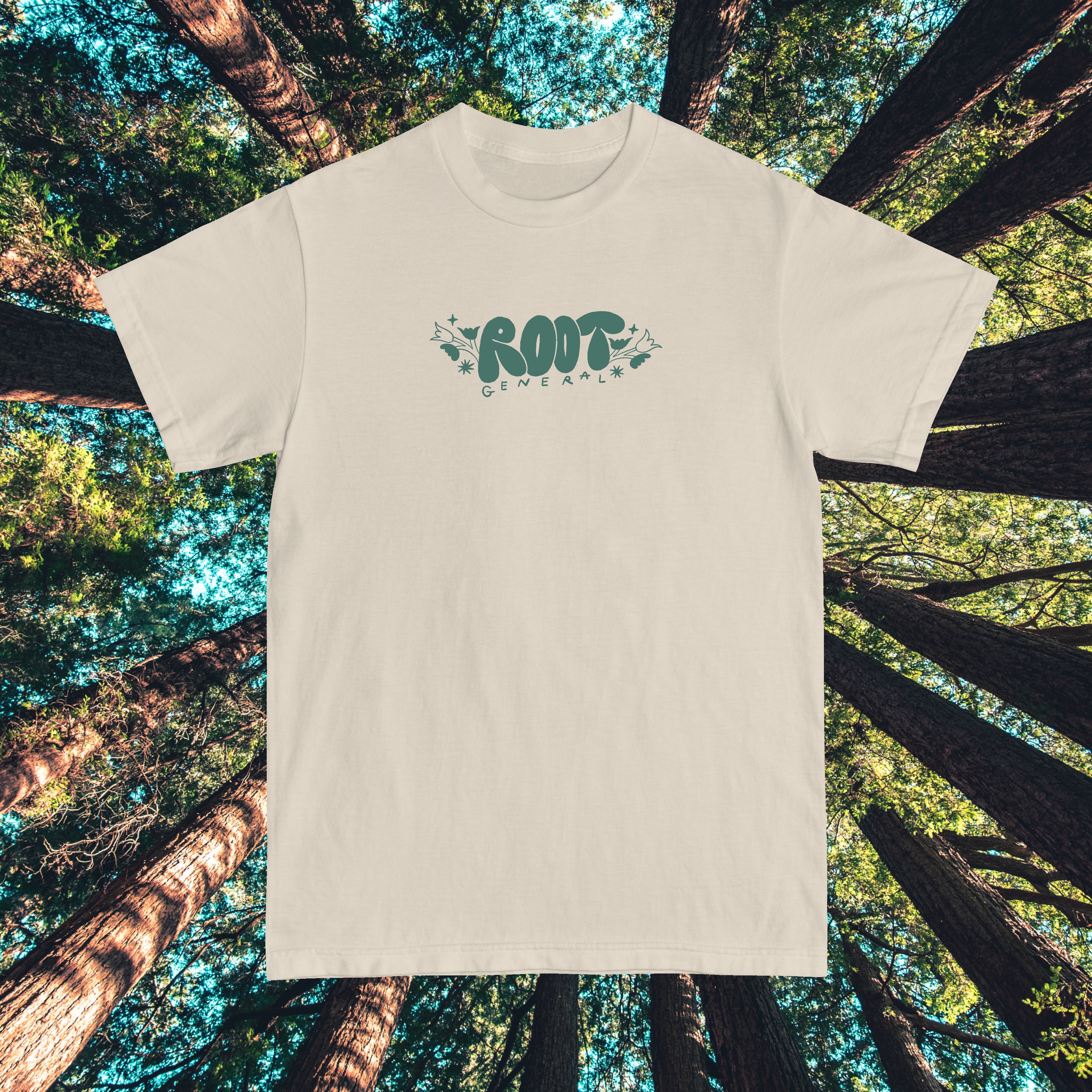 Front and back designs printed in green on an ivory t-shirt.